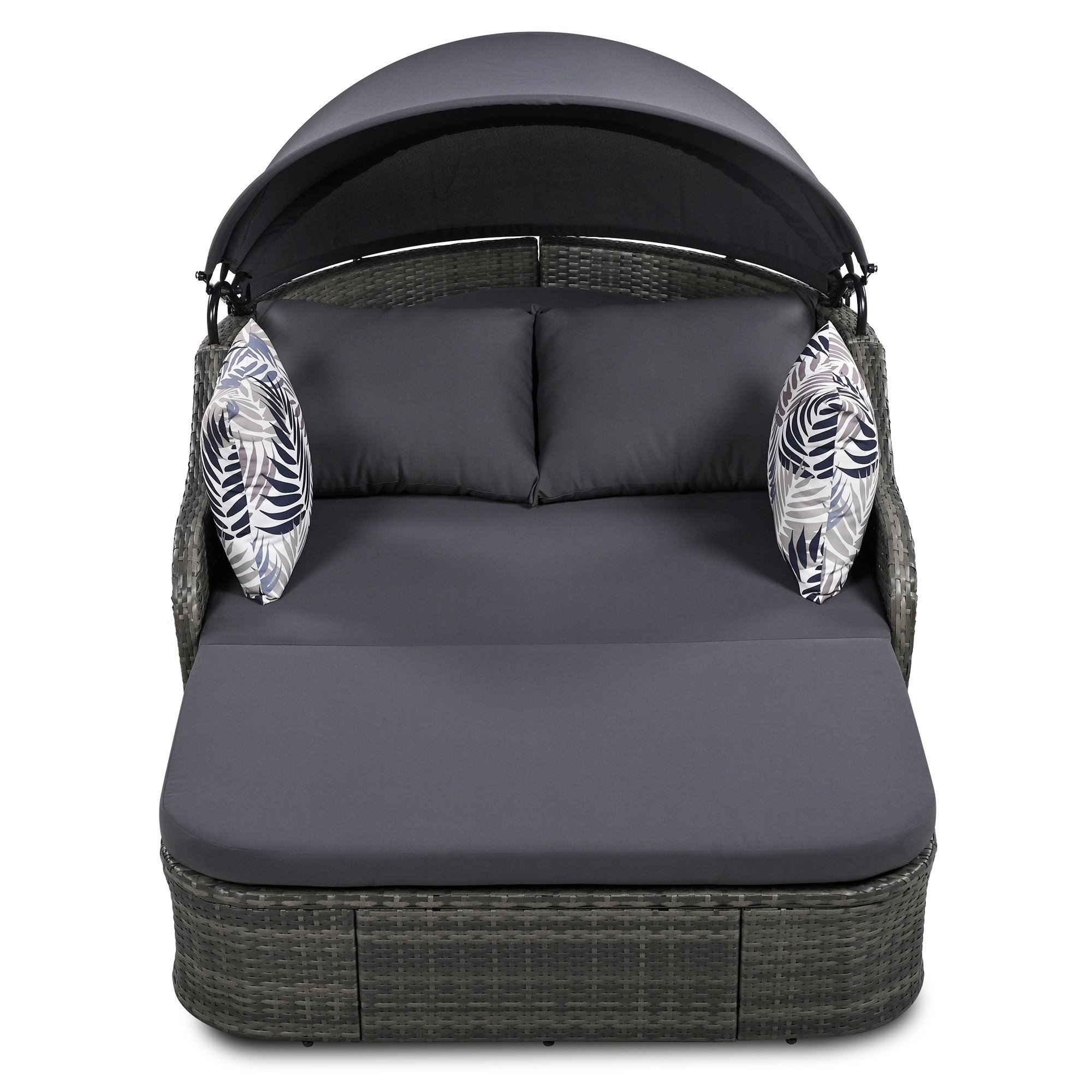 Introducing the Outdoor Sun Bed; known for its durability and style. It's crafted with high-quality PE rattan materials ensuring longevity; perfect for your outdoor relaxation. All cushions and pillows are zippered for easy cleaning. Measuring 79.9 inches in length and 52.4 inches in width it can comfortably accommodate two adults. The adjustable canopy on the lounger shields you from sunlight; allowing for the ultimate relaxation experience. The half-package stylish curved armrests provide support where needed while still exhibiting elegance. Featuring a comfortable backrest and an sloped angle; you can easily recline while enjoying the outdoors. Don't worry about bringing extra pillows as the lounger includes two large gray pillows and two colorful decorative pillows. Adjustable feet for uneven ground make you comfortable in any place. Enjoy the best of the outdoors time with this Outdoor Sun Bed!